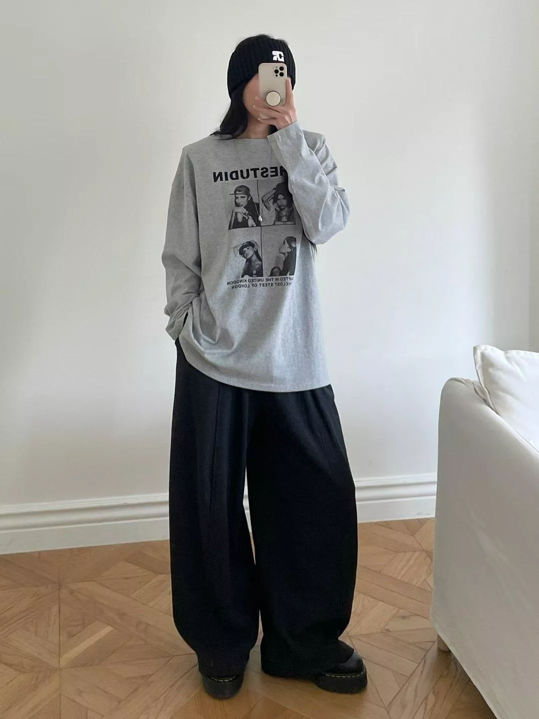 韓國流行穿中低腰的位置,加上褲子本身有重量,垂墜的很好看~